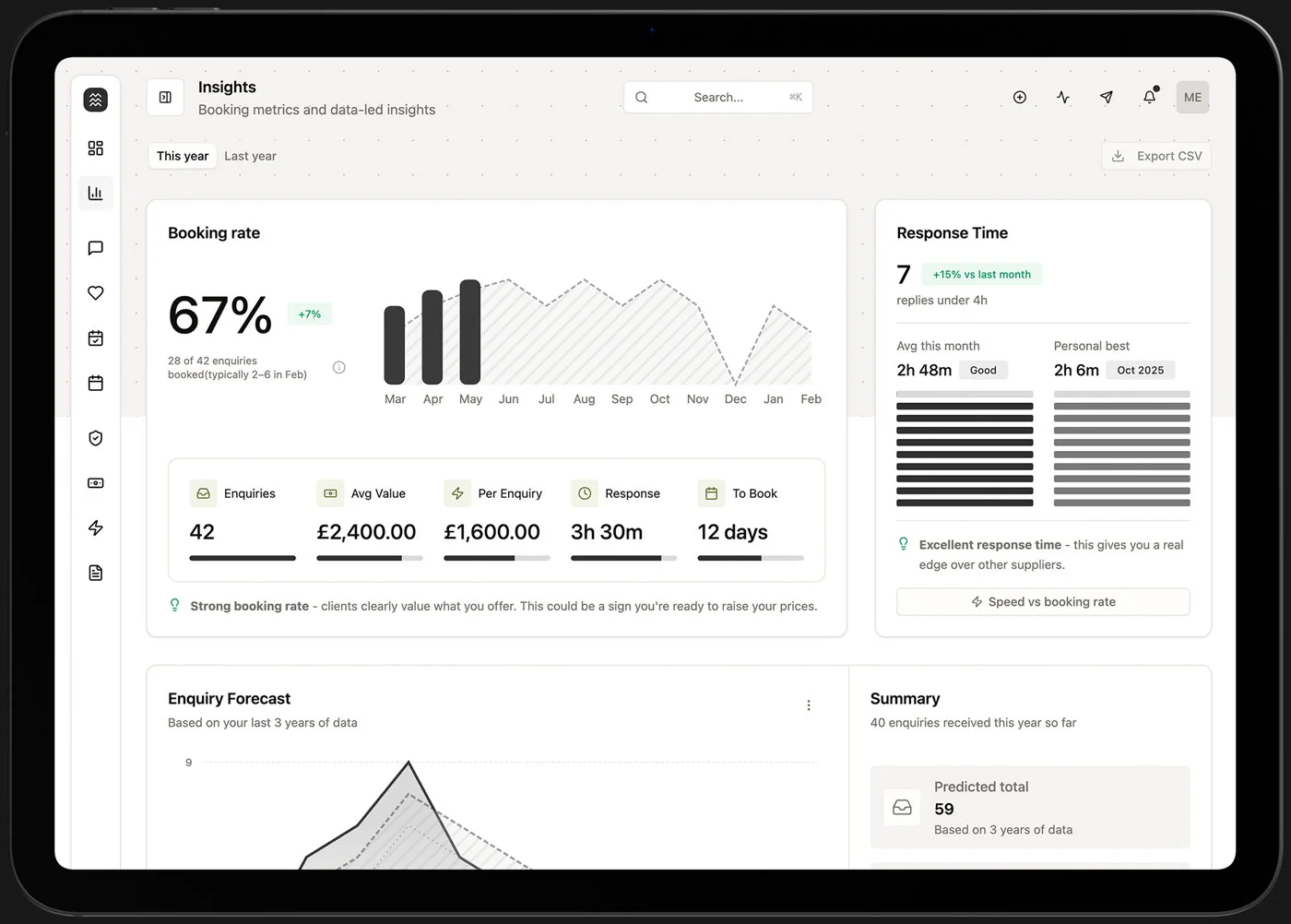 - Book more, not just track moreSee your real booking rate, spot where couples drop off, and know which enquiries need attention right now.